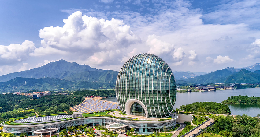 包括兩大部分:一是雁棲島(雁棲半島)國際會議中心及配套設(shè)施(夏園、雁棲島酒店和別墅群),二是岸邊的北京雁棲湖國際會展中心及相關(guān)的北京日出東方凱賓斯基酒店。會議中心主建筑是“漢唐飛揚”,會展中心主建筑是“天圓地方”,兩大板塊相輔相成。