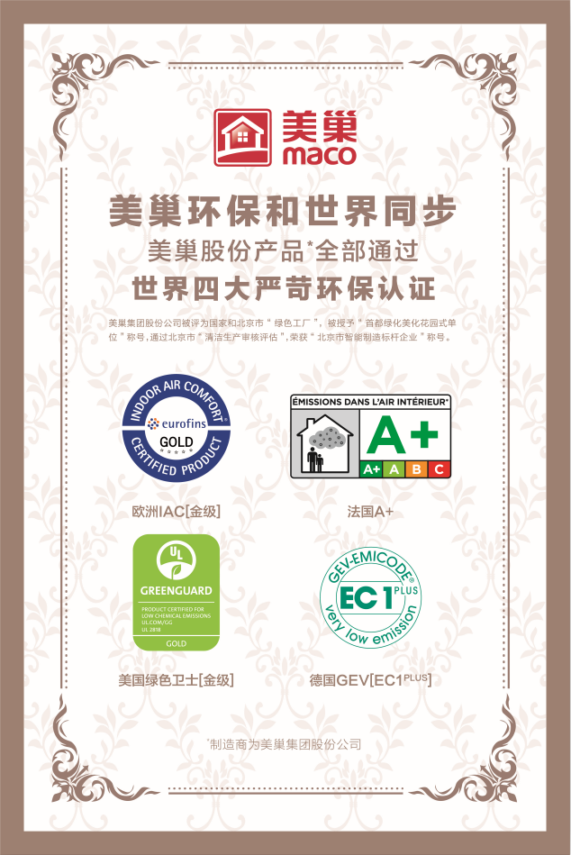 美巢集團(tuán)股份公司產(chǎn)品全部通過美國UL室內(nèi)空氣質(zhì)量綠色衛(wèi)士GREENGUARD [金級]認(rèn)證、歐洲Eurofins室內(nèi)空氣質(zhì)量IAC金級認(rèn)證、德國GEV低揮發(fā)物釋放產(chǎn)品標(biāo)識EMICODEEC1PLUS認(rèn)證以及法國室內(nèi)空氣環(huán)境VOC法規(guī)French A+級標(biāo)準(zhǔn)。