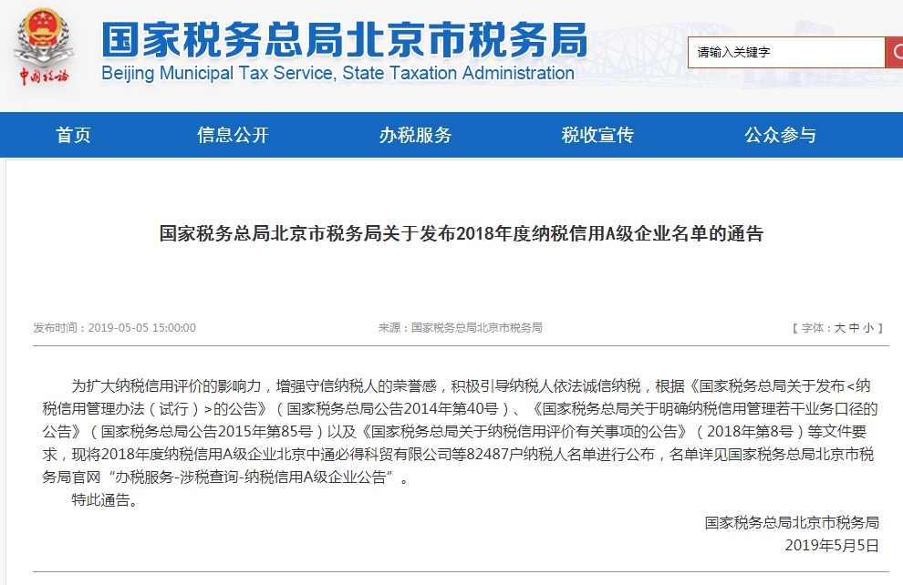 2019年5月5日,為擴(kuò)大納稅信用評(píng)價(jià)的影響力,增強(qiáng)守信納稅人的榮譽(yù)感,積極引導(dǎo)納稅人依法誠(chéng)信納稅,國(guó)家稅務(wù)總局北京市稅務(wù)局發(fā)布了2018年度納稅信用A級(jí)企業(yè)名單。