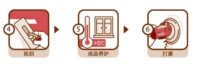 | 批刮找平: | 膩子每次批刮厚度應(yīng)大于0.5 mm,不超過1.5mm,批刮總厚度不超過2mm,一次批刮過厚易出現(xiàn)干縮開裂。找平厚度大于2mm 應(yīng)先用墻尼粉刷石膏進行抹灰找平。膩子找平應(yīng)在半干狀態(tài)下(用手輕壓不變形)完成,固化后用水砂紙打磨找平。 |