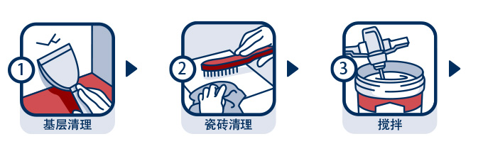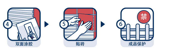 | 施工事項: | 瓷磚背面應無明水,無浮灰、油污、脫模劑等影響粘結(jié)的雜質(zhì)。禁止無縫貼磚,磚縫不小于2mm。建議使用齒形刮刀在基層與瓷磚背面同時薄刮瓷磚膠粘劑進行雙面涂膠,在不利環(huán)境(如高溫、有風等)或基層吸水率較高條件下,應盡快粘貼瓷磚。攪拌好的膠漿須在2小時內(nèi)用完。 |